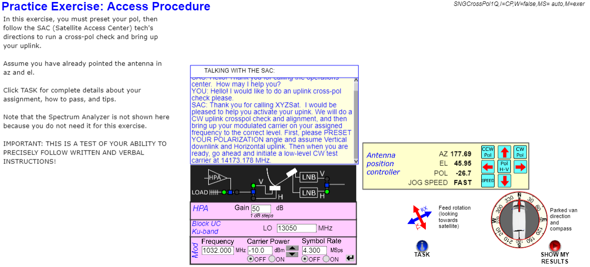 Certification/recertification exam for advanced-level operators of mobile or fixed earth stations used for uplinks of video or other continuous carriers with manually-operated antenna pointing, RF equipment, and modulators, such as traditional SNG trucks. (Not centrally-managed modems or auto-point antennas).