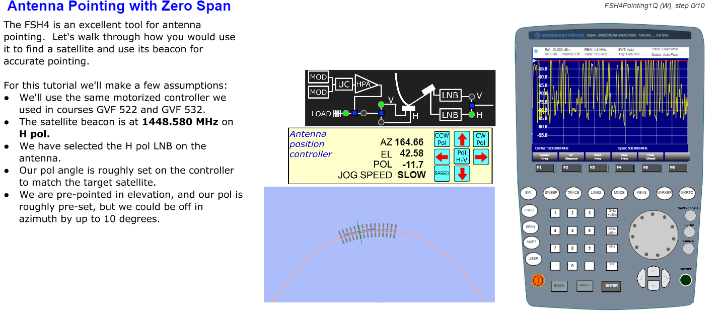 The Rohde and Schwarz model FSH4 is an advanced, highly flexible, portable spectrum analyzer, designed for wireless, microwave, satellite, and other RF and microwave applications. In this course we will apply the general concepts of spectrum analysis from GVF 522 to the specifics of using the FSH4 for satellite applications. We will learn about using the FSH4 controls and display, discuss optimizing settings for best display of certain signal types, work through some practical examples, and discuss some of the FSH4's advanced features. The course includes numerous videos as well as a live, interactive functional simulator of the FSH4.