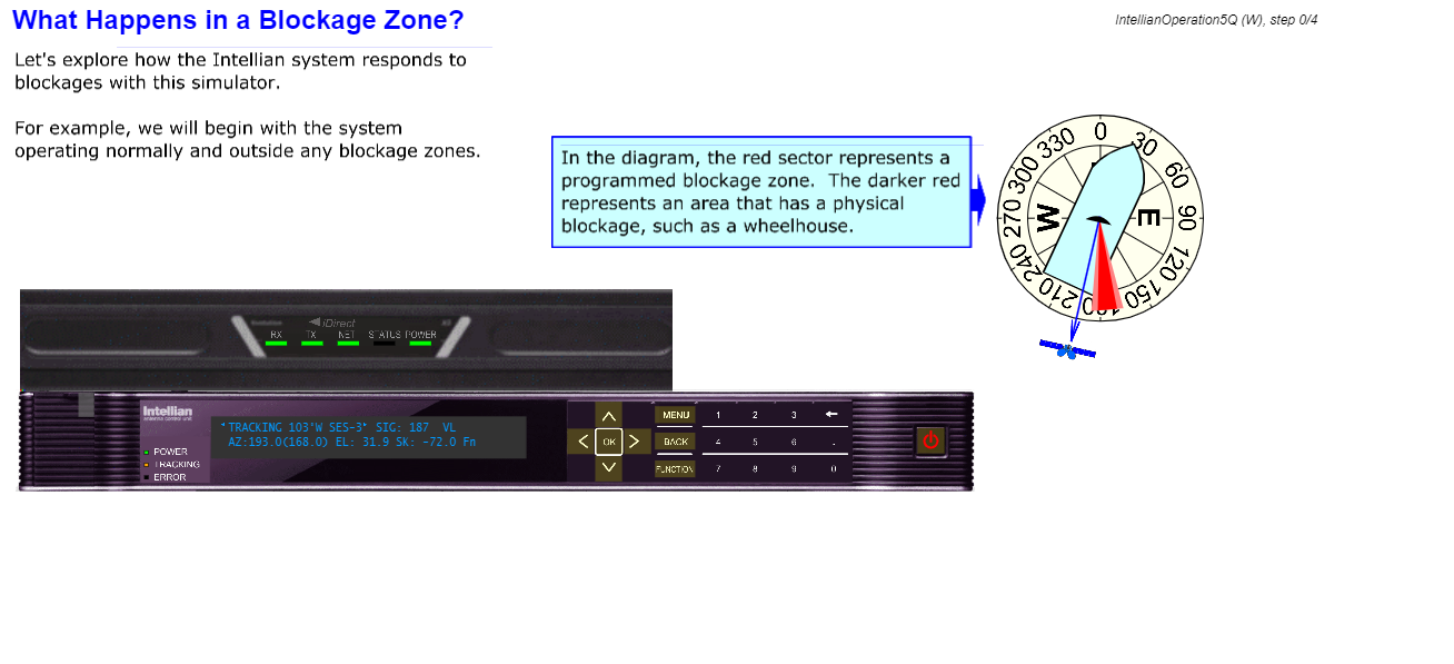 Topics covered include hardware components of the Intellian v100 VSAT terminal, principles of operation of the terminal, startup and shutdown procedures, using the front panel operating controls, satellite modem operation, operator‐level troubleshooting, and preventive maintenance. Animation and simulator-based interactivity are used throughout the course to explain critical skills and concepts.