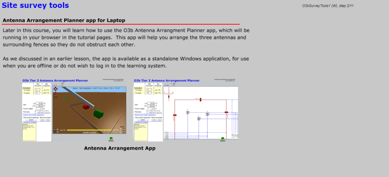 In this course, you will gain the knowledge and skills required to survey a potential site for an O3b Tier-2 fixed terminal. You will learn how to use the included Antenna Arrangement Planner app to plan compact multi-antenna placement arrangements with a clear line of sight to the O3b arc. You will also learn how to use the included O3b Line of Sight mobile app, prepare for the site visit, fill out the survey report, plan the IFL run, analyze the existing AC/mains power system, document data inferface points, select a location for the indoor equipment, gather other necessary information, and report site details critical for a successful system installation. This course also includes all the forms that must be completed and submitted to SES after a survey, as well as access to specially-developed smartphone and Windows apps.