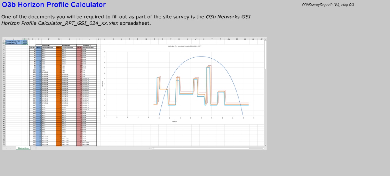 Manual line-of-sight analysis. Learn how to do the O3b fixed terminal site survey in the event you are not able to use the O3b Line of Sight app or the Antenna Arrangement Planner.