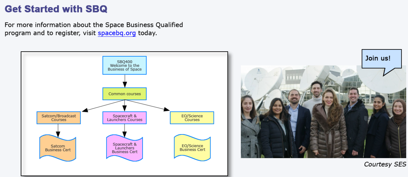 You will learn about the business of space, satellites and their benefits. You will also learn about the SBQ certification series of courses and how they can benefit your career. The course contains four short lessons, each with knowledge check questions (unscored). To complete the course, you must view all pages.